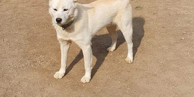 She is a stunning white cross breed (Jindo) akin to an Akita or white German Shepherd. She is getting used to UK life now and we are looking for her forever home.